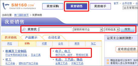 您首先点击主菜单“我要销售 ”。您可以通过关键字或产品类别查找买家。
